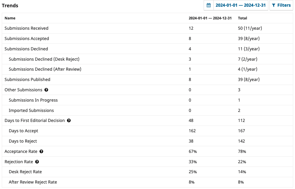 Estadísticas de la actividad editorial en el año 2024 y totales desde el inicio de la revista.