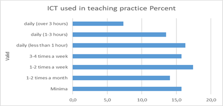 With respect to the use of ICT in teaching practice, 17,4% of the participants stated that they use ICT in education 1-2 times a week, 16,3% stated that they use ICT less than an hour daily, the 15,7% stated that they use ICT in education less than 1-2 times a month, 14% that they use ICT in education 1-2 times a month, 13,5% that they use ICT in education daily for 1- 3 hours and 7,3% use ICT in education daily for more than 3 hours (Fig. 2).