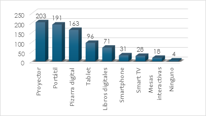Al analizar los dispositivos tecnológicos y digitales que más suelen ser empleados dentro del aula, y teniendo en consideración que se podía marcar más de una respuesta, es el proyector es más empleado, con 203 (61,5%) respuestas dadas, seguido de cerca por el portátil, con 191 (57,9%) profesores que así lo expresan (Figura 1).